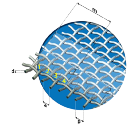 金屬網 訂購規格要件: 材質 編織類型 線徑(Diameter, d) 孔徑(Aperture, a) a = p - d =(25.4㎜ ÷ m) - d 目數(Mesh Count, m)為每英吋長包含之網孔數 m = 25.4㎜ ÷ p 節距(Pitch, p)為兩線中心點相差之距離 p = a + d 寬度及長度,用英吋、英呎或釐米、米 數量 網邊之處理(僅菱形網、輸送帶網、振動篩網需要) 相關規格資訊: 方形網開孔率(o) o = ( a ÷ p )2 x 100%